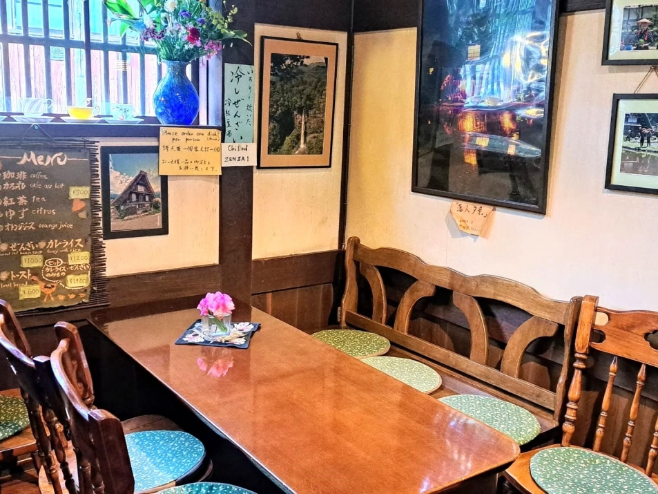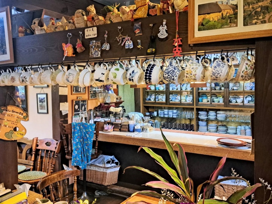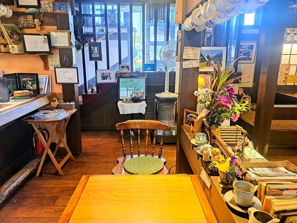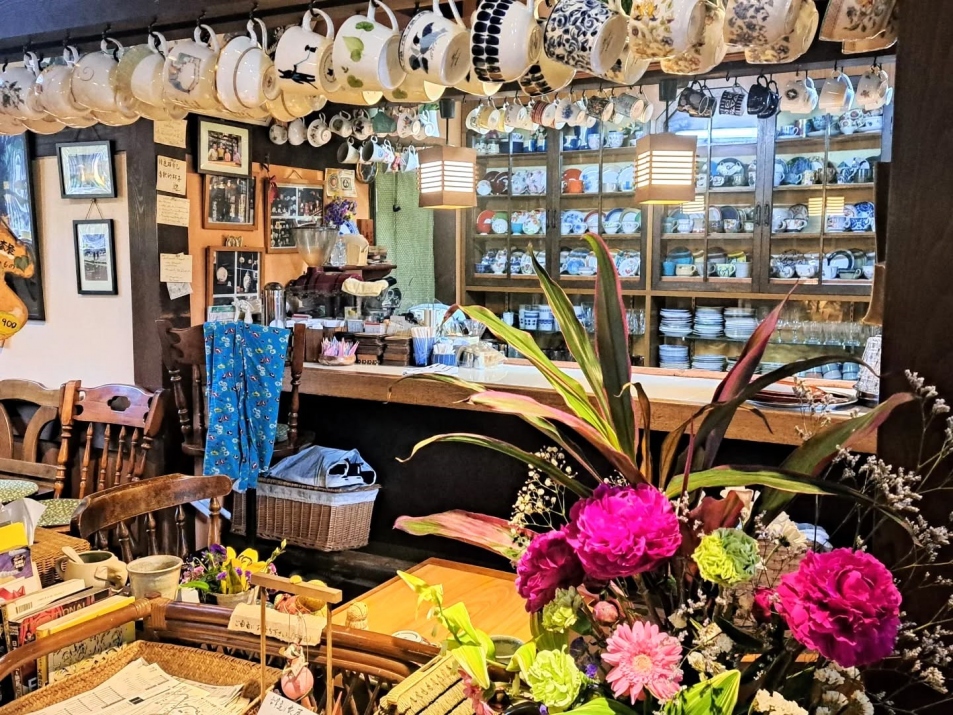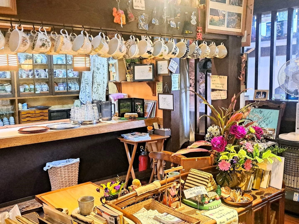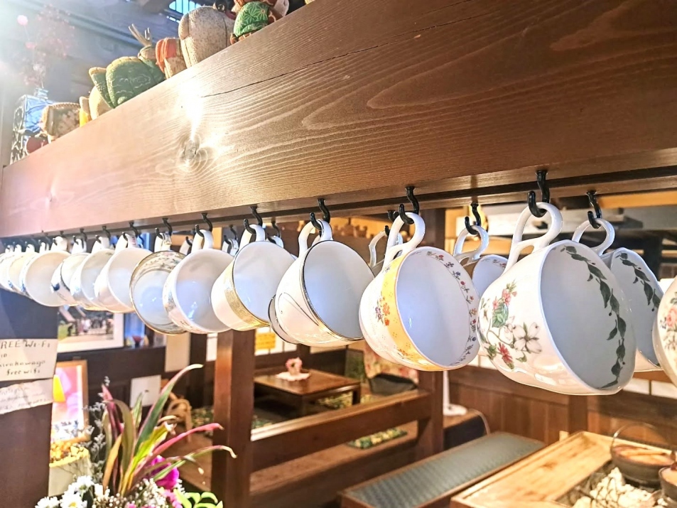 また、店内に吊るされた多数のコーヒーカップからお好みのものを選び、天然水で淹れたコーヒーを味わうことができます。