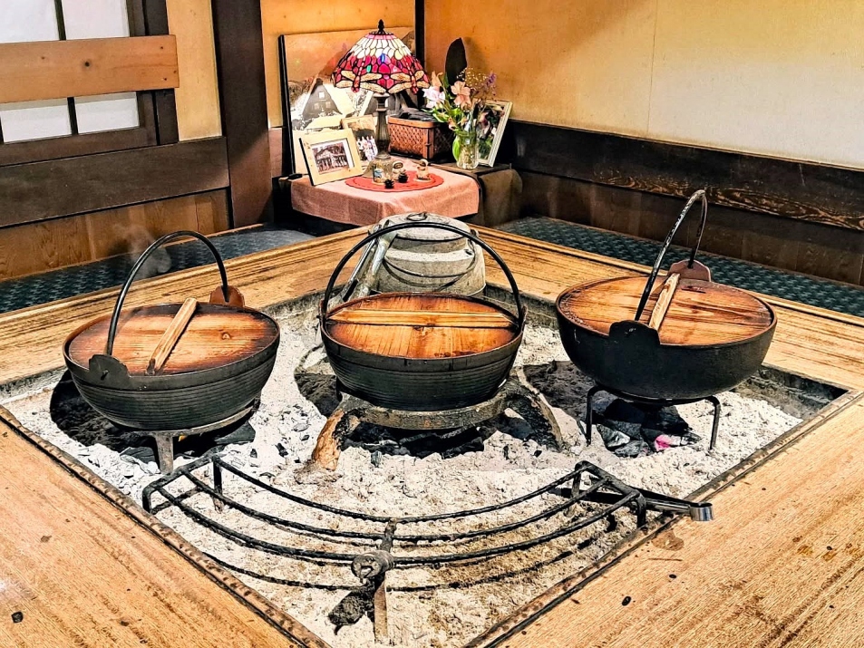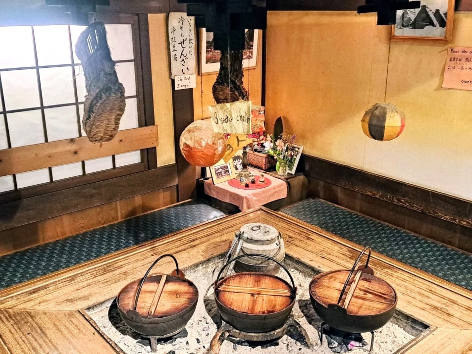 店内の地下に降りると、囲炉裏を囲む温かなカフェスペースが広がります。