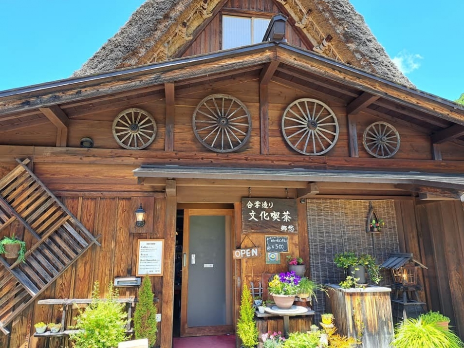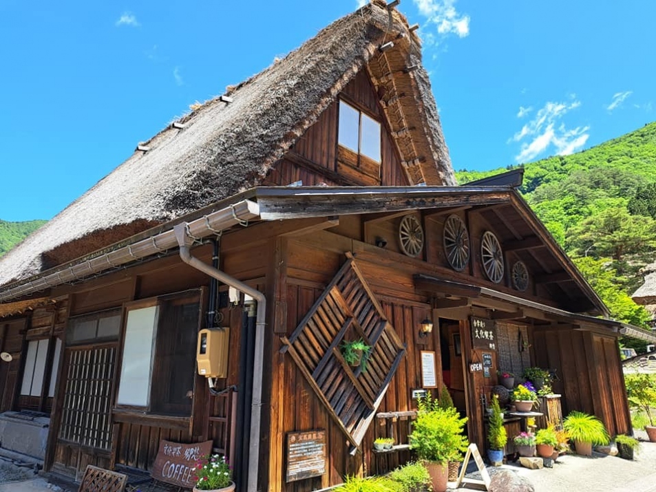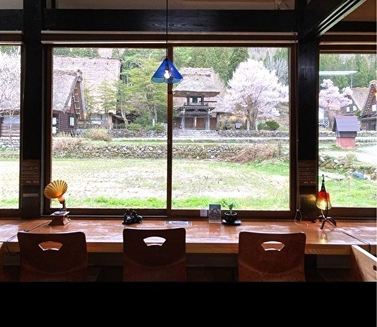 白川郷の景色を楽しむことができる静かな合掌造りの落ち着いた雰囲気のコーヒー専門店。