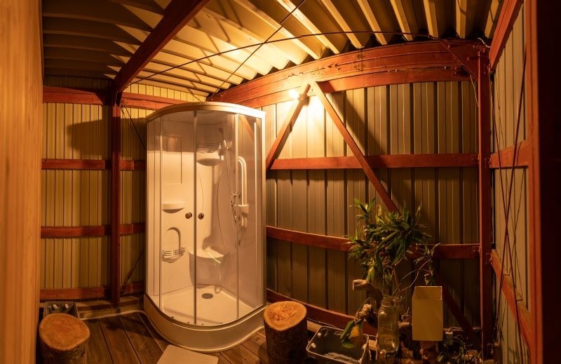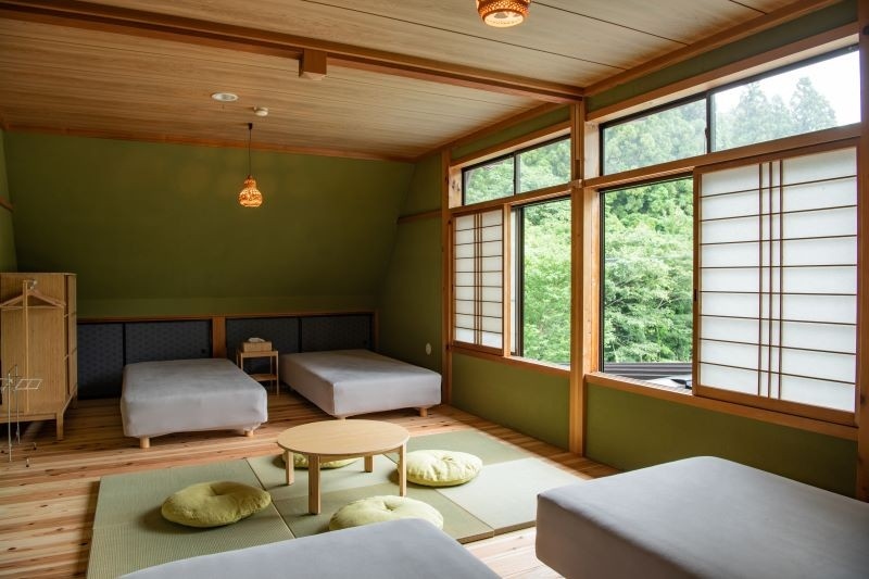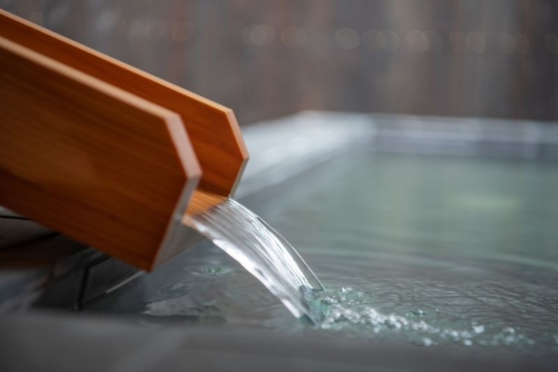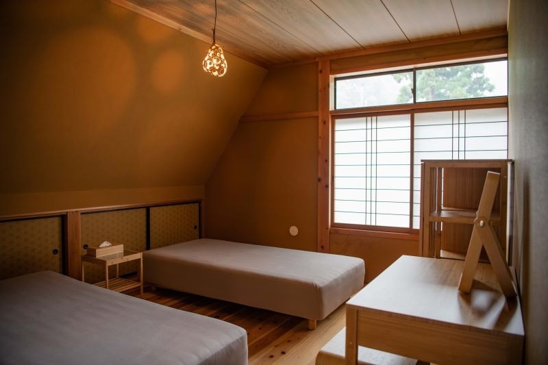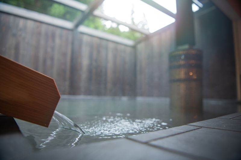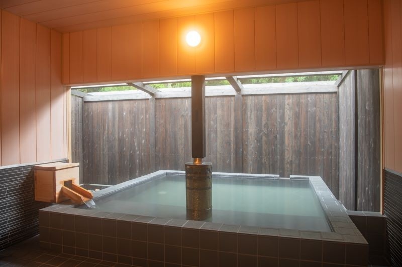 This is an accommodation facility with an open-air hot spring bath fed directly by the source, and a wood-burning stove sauna in a repurposed garage.