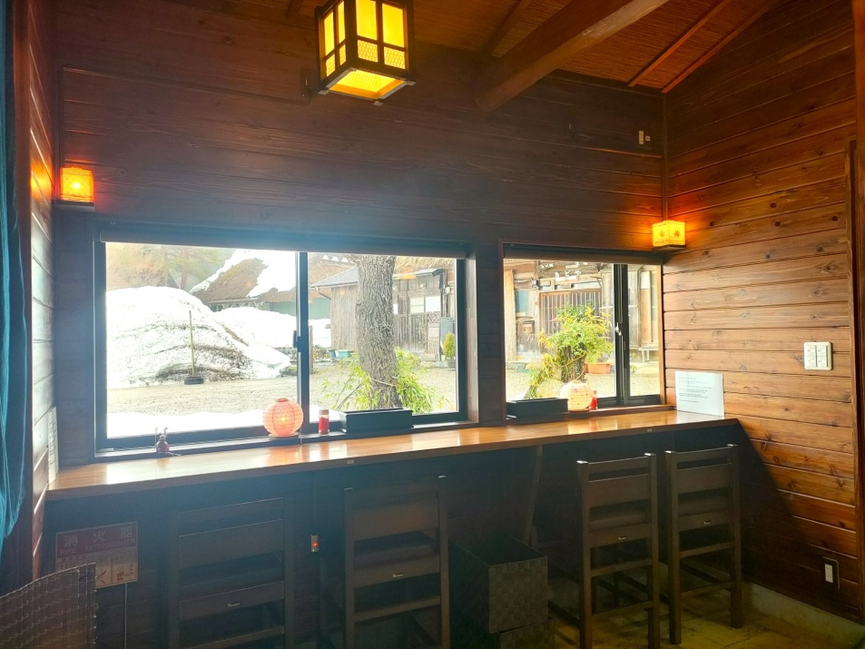 店内は落ち着いた雰囲気で窓からは合掌造りが眺められます。