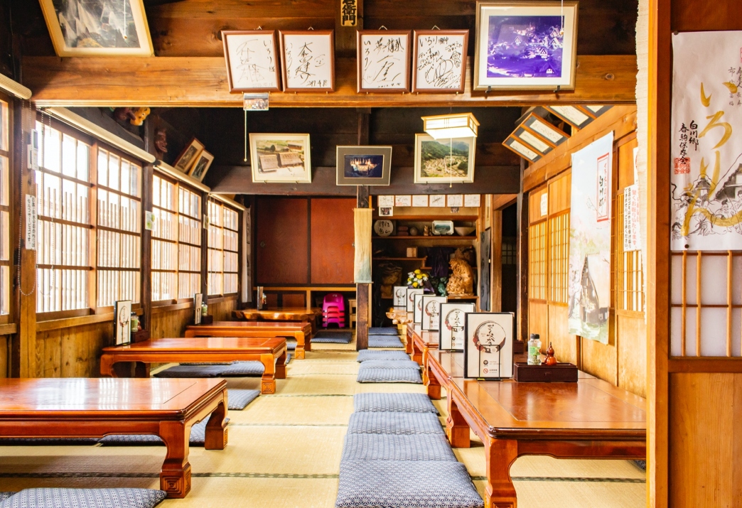 您可以在世界遺產白川鄉的合掌屋中用餐。我們推薦您品嚐燒豆腐定食、蕎麥芯粥套餐。
